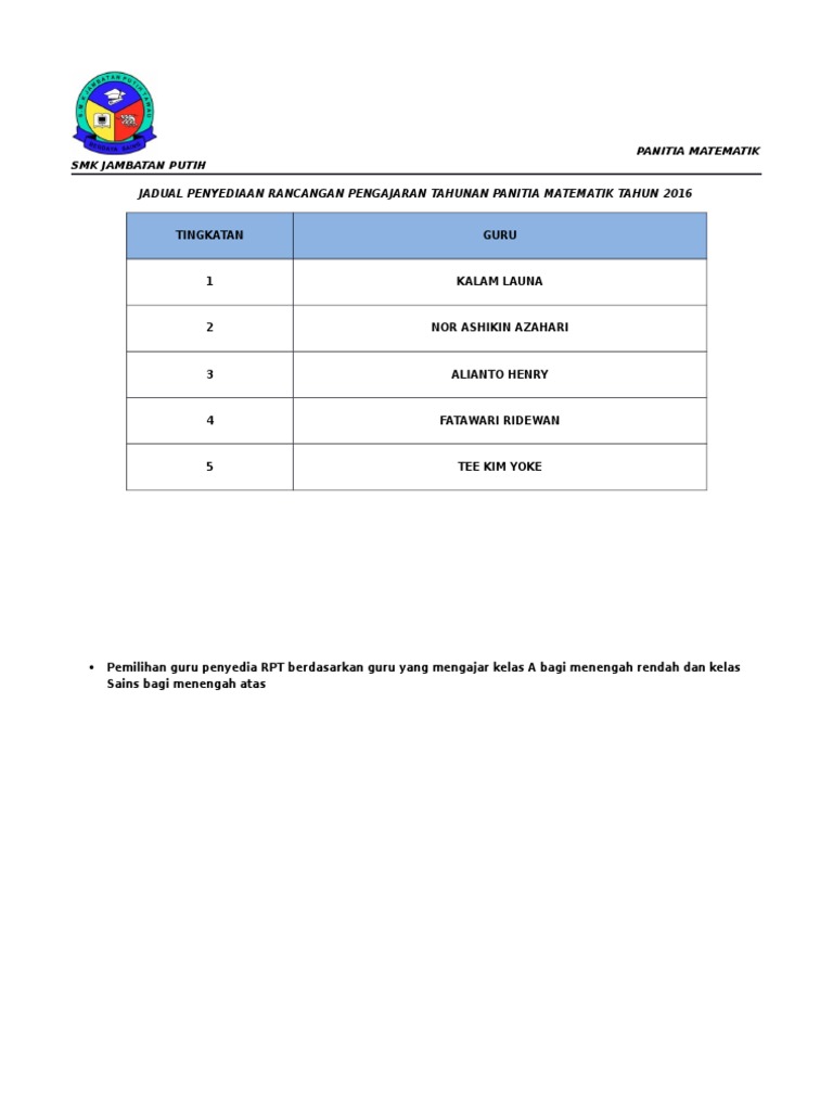Posted by SMK Sungai Layar dan Pendidikan Khas Integrasi at 133200. RPT Matematik BM Untuk tahun 2013 Disini ada rancangan pengajaran tahunan untuk Matematik menggunakan Bahasa Melayu Malaysia BM Download RPT Math BM Rancangan Pengajaran Tahunan Matematik Tingkatan 1. Rohaya report rancangan pelajaran tahunan matematik tambahan tingkatan 4 2016.