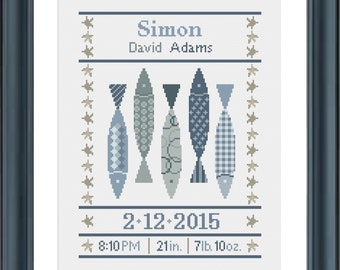 Cross Stitch Baby Birth Sampler Fish Birth Announcement Baby Etsy